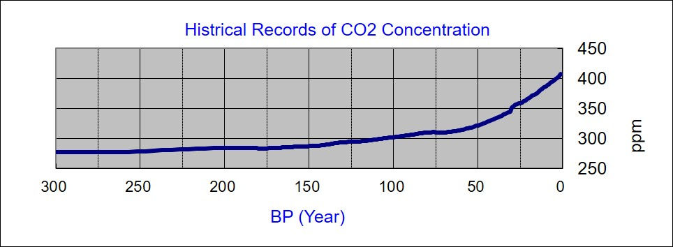 It is evident from the above graph that, about BP 100 (AD 1917) and beyond, the chart has reached the max. value ever-recorded and further continues to be ever-increasing. Referring to the days of industrial revolution, BP 267-187 (AD 1750- 1830), the first 100 years after the industrial revolution and additional 87 years must have been changing very slowly. However, beyond BP 100, the increasing rate seems to be exponential. This phenomenum is understood more clearly if the following two (2) types, one for the near past less than BP300 and the other forcused for the long-distant past, of chart with normal axis are displayed.